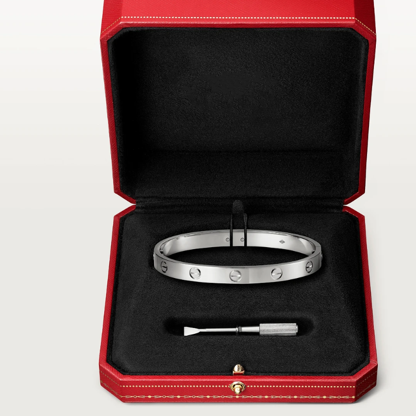 Bracelet love, plaqué argent, vendu dans son écrin. Largeur 6,5mm